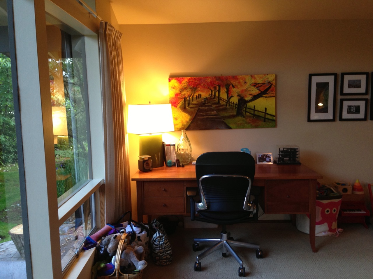 I spend most of my time when I’m at home in these two connected rooms: the family room and kitchen. The family room serves three purposes: 1) Hazel’s play room, 2) My office, and 3) Relaxing on the couch in front of the fireplace (sadly, this rarely happens).